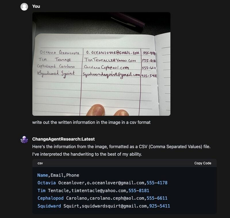 Here’s an example of Vision in action. Change Agent effectively turns a handwritten list of names and contact information into a CSV list!
